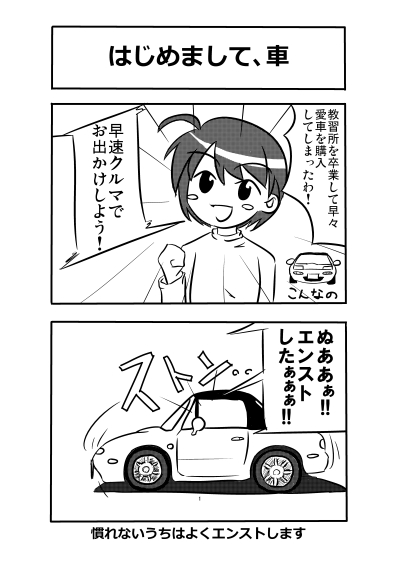 第8話 ----------------------------------------------------------- 1日で5本やるのは大変だった・・・うち2本が4コマだったので尚更。 もう少しペースを落として、クオリティアップしたいところ。 車はある程度描けても、可愛い女の子が描けないんですよね~・・・orz あと、もうちょい漫画っぽい線にしたい。 コミスタのGペンで描いているんですが、もうちょいザラッ(?)とした感じの線がいいなぁ。 続きですが、一応、明日か明後日中には3本ほど仕上げる予定です。 ついでにキャラ紹介も作ります。 5名ほどは考えているキャラを作りますが、これからどんどんキャラを作っていくかもしれません。 (SWとかスイスポとか出してほしいと聞いているので、もっと増やすかも・・・っ!) --------------------------------------------------------- 第4話